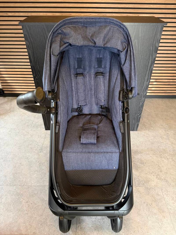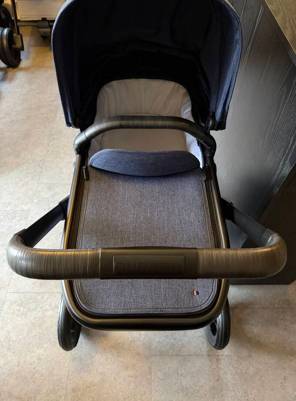 Een prachtige Dubatti kinderwagen in de kleur Navy Blue Melange (Donkerblauw Gemêleerd) met een volledig zwart onderstel en frame.